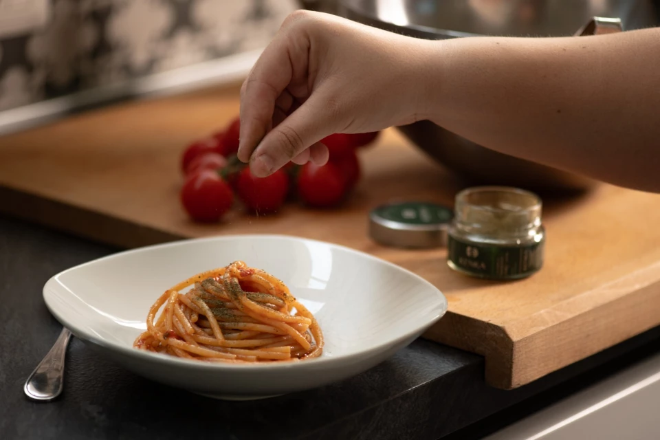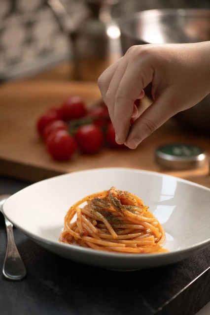 Gli spaghetti al pomodoro con Polvere di Basilico Kenka rappresentano un classico intramontabile della cucina italiana, arricchito da un tocco innovativo e moderno.