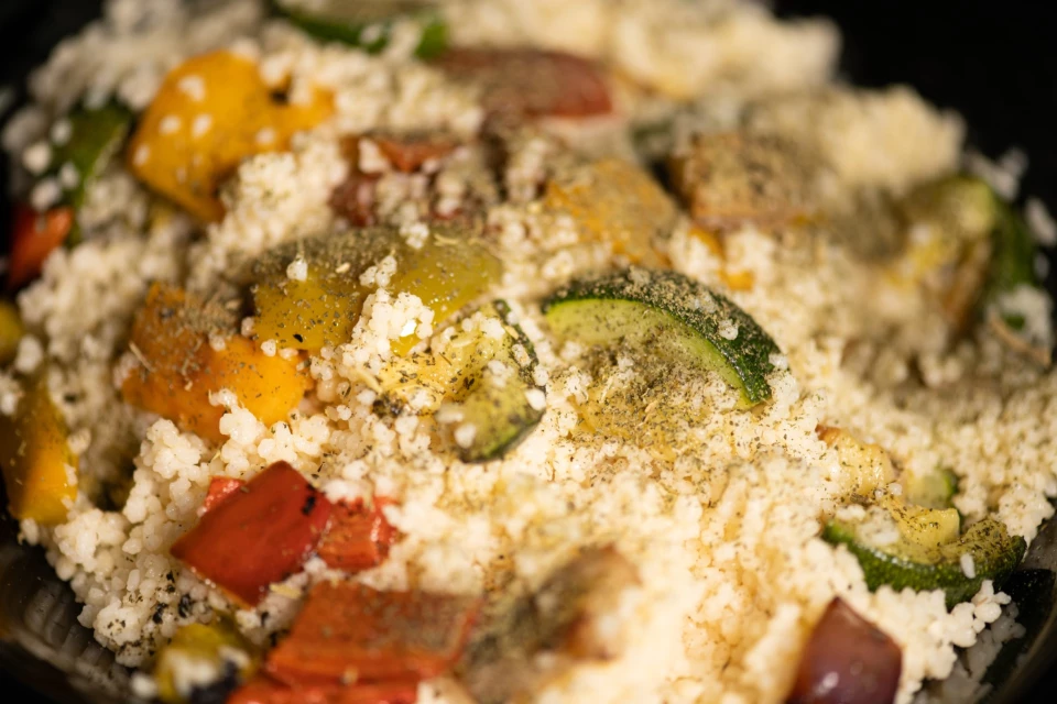 In una ciotola capiente, unisci il couscous con le verdure saltate. Aggiusta di sale e pepe a piacere.