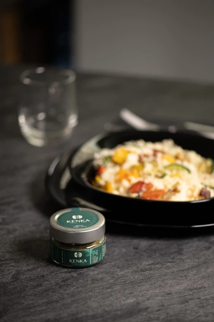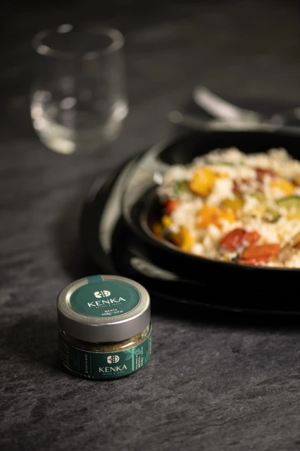 Puoi utilizzare tutte le verdure di tuo gradimento come: zucchine, peperoni, pomodori e cipolle, tutti tagliati a piccoli cubetti e saltati leggermente in padella. Il vero segreto di questa ricetta, però, è la Polvere di Menta Kenka.